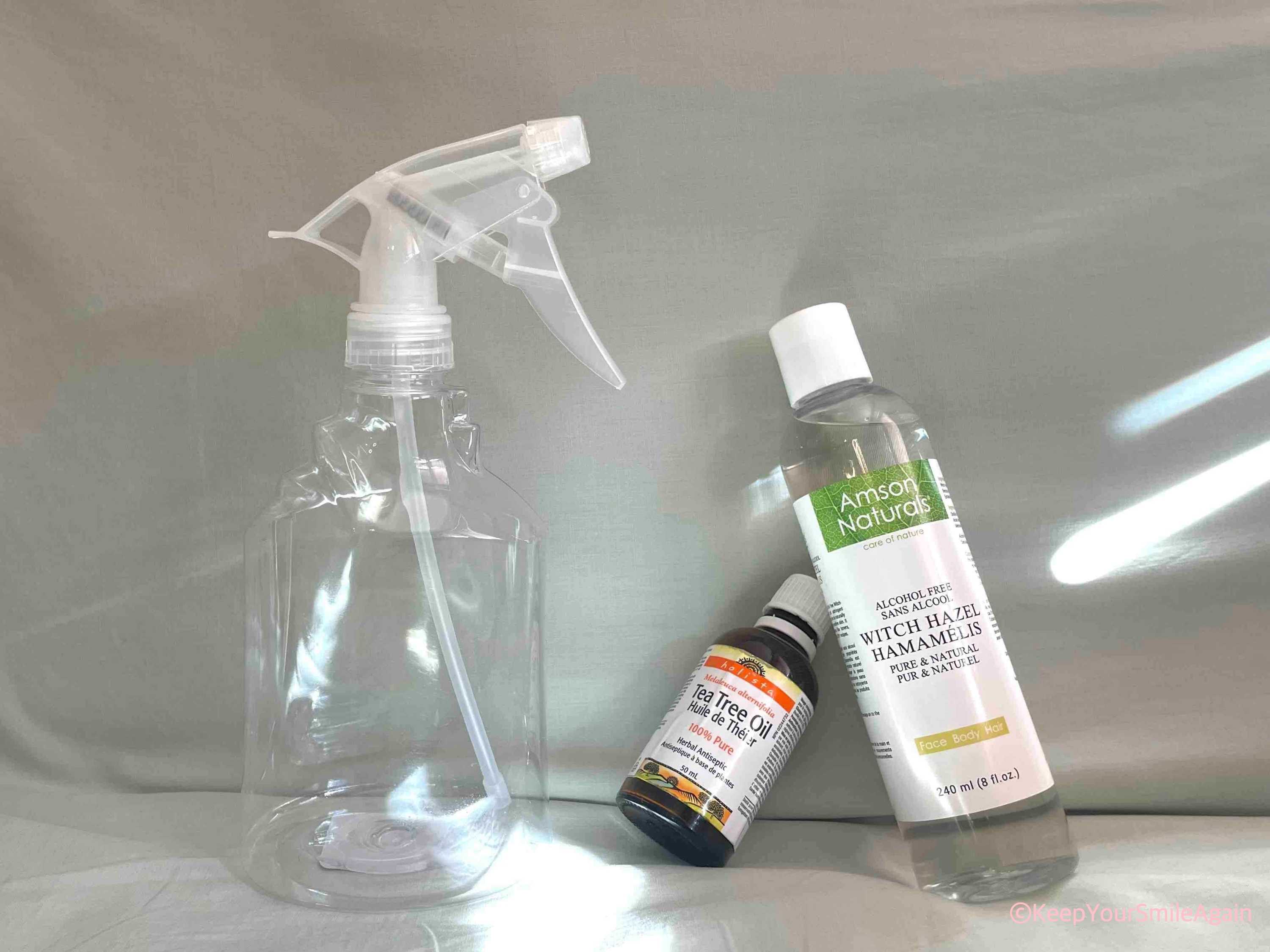 분무기에 위치하젤, 에센셜 오일, 물 넣고 쉐킷쉐킷!