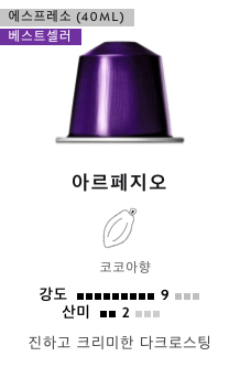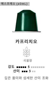 마셔본 네스프레소 캡슐들 중에서, 제 입맛에는 산미와 쌉싸름함의 균형감이 가장 좋아 가볍게 마시는 용도로 항상 구비해 둡니다. 얼음 가득 채운 유리잔에 카프리치오 뜨겁게 내리고, 몇 분 후 한 모금하면 모자라지도 부족하지도 않은 맛에 기분이 좋아지더라고요 :)