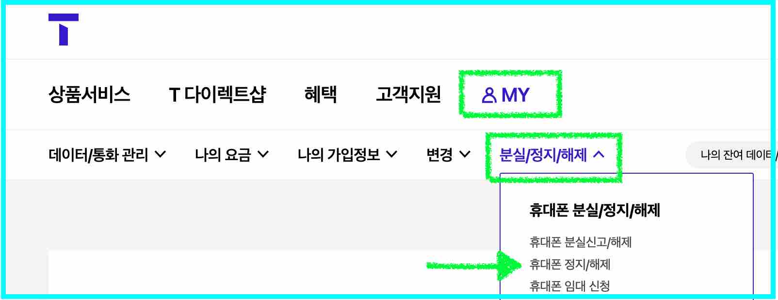 아래 링크 클릭 시, SKT 휴대폰 정지/해제 화면으로 (로그인 후) 이동하기