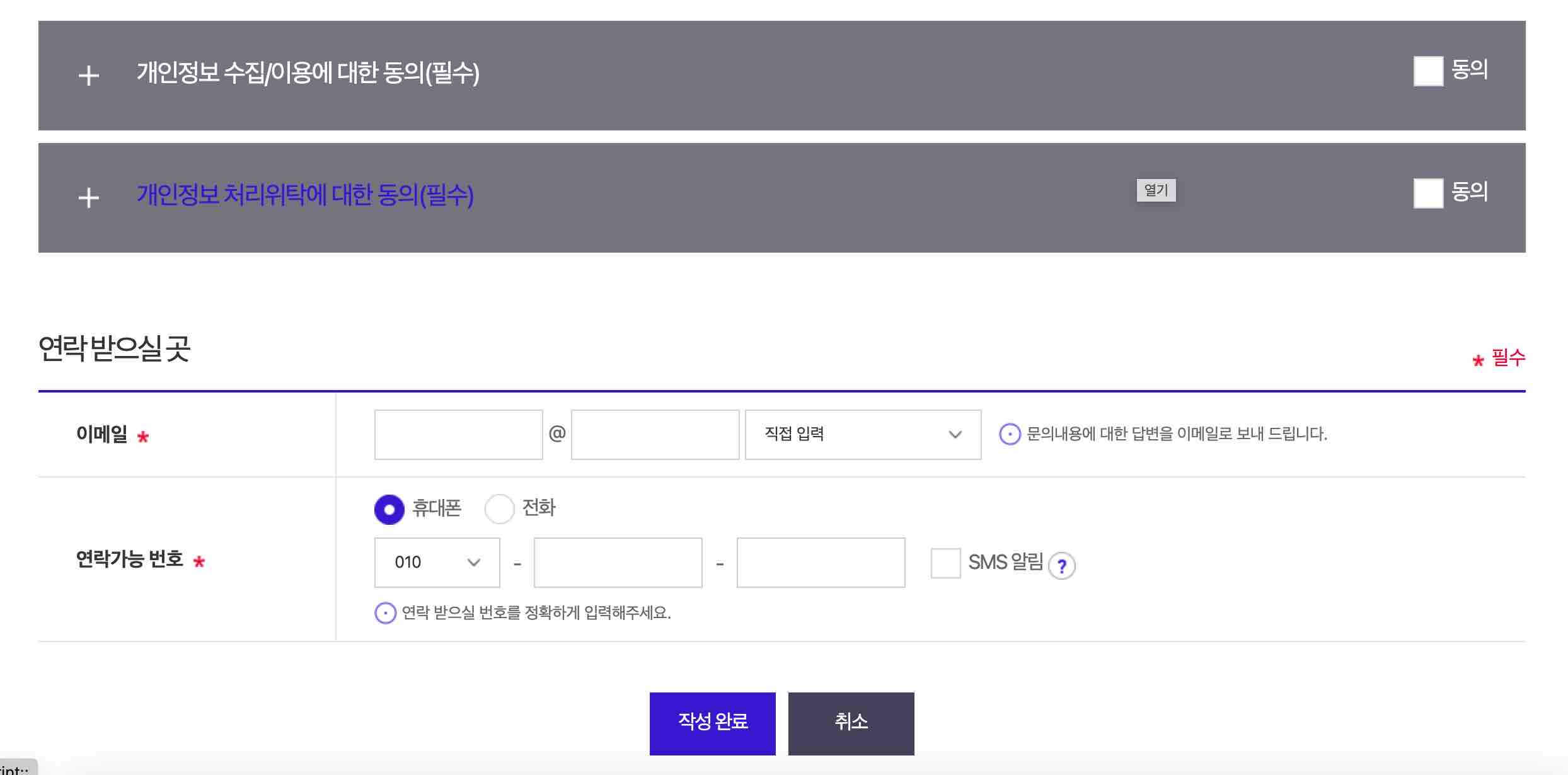 4) 개인정보 수집/이용 및 처리위탁에 대한 동의하고, 연락받을 이메일 및 번호 기입 후 완료.
